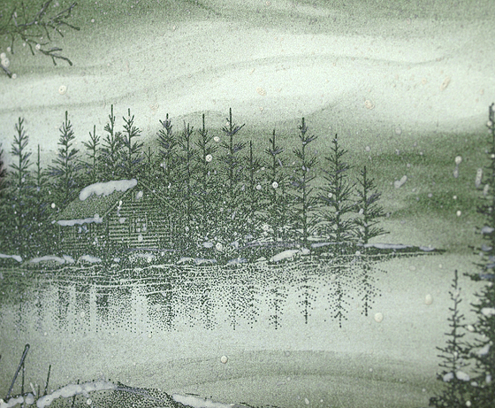 Black & White card: Stampscapes: Lakeside Cabin 147G, Reeds 068D, Pine Tree 196F, Crooked Limb 107E; Adirondack Pitch Black dye ink; Core’dinations Opal Pearl card; Daler & Rowney Acrylic Artist Ink white; Colorbox Stylus tool.
