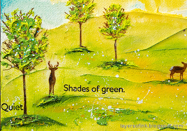 Here you can see that I painted a darker brown on one side of the deer. The 'shades of green' sentiment was originally inspired by spring-time trees.