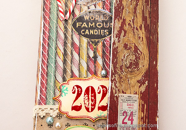 The year was stamped with Tim Holtz Worn Text, which was also used for the numbers in my Countdown Calendar. The two smaller labels were stamped with words from Simon Says Stamp Document It.