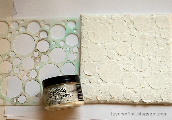 Coat the canvas with gesso and when dry add Texture Paste through the Simon Says Stamp Mix and Match Circles stencil with a palette knife.